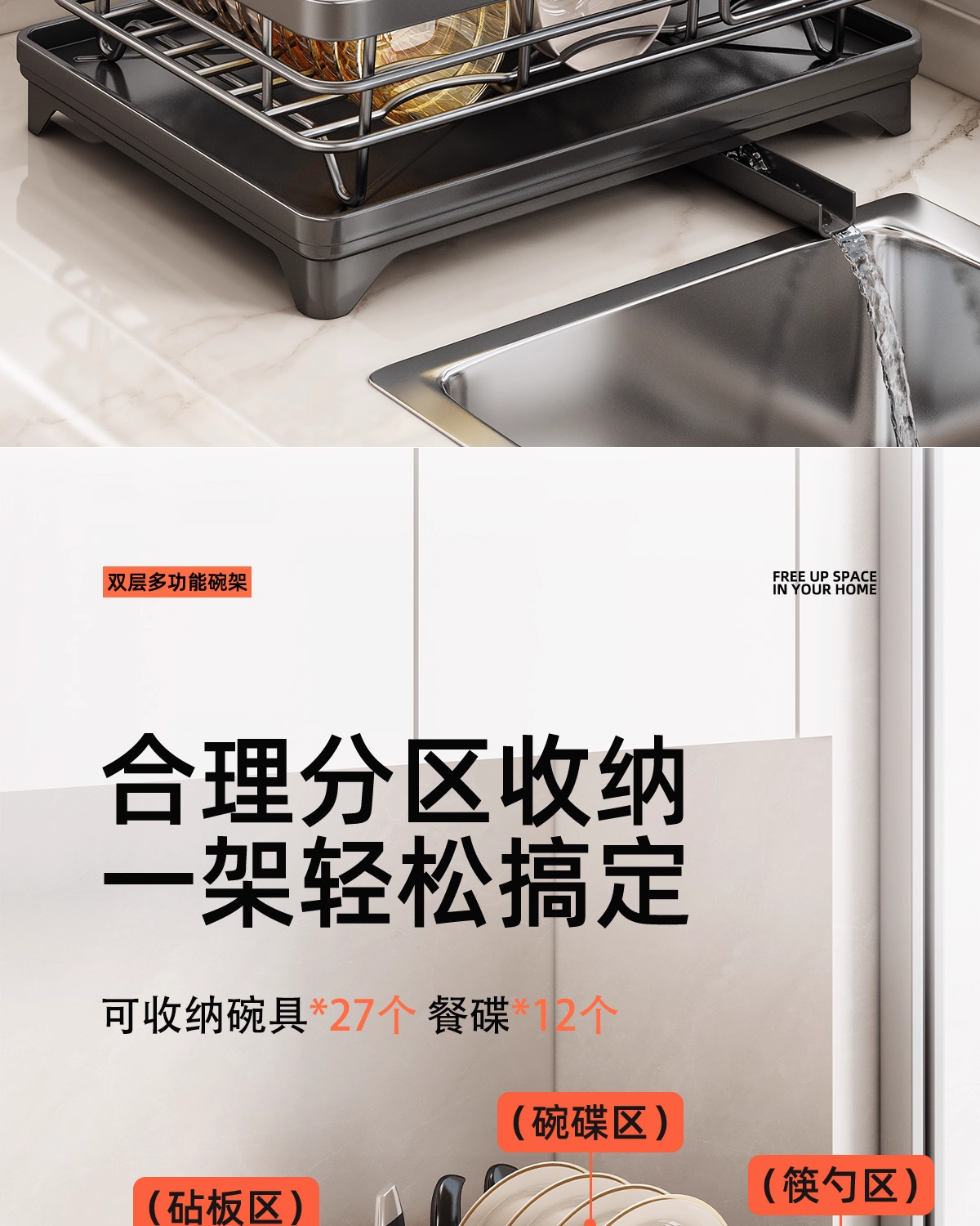 优勤碗碟收纳架沥水碗架厨房置物架不锈钢碗盘碗筷放碗盘子沥水篮